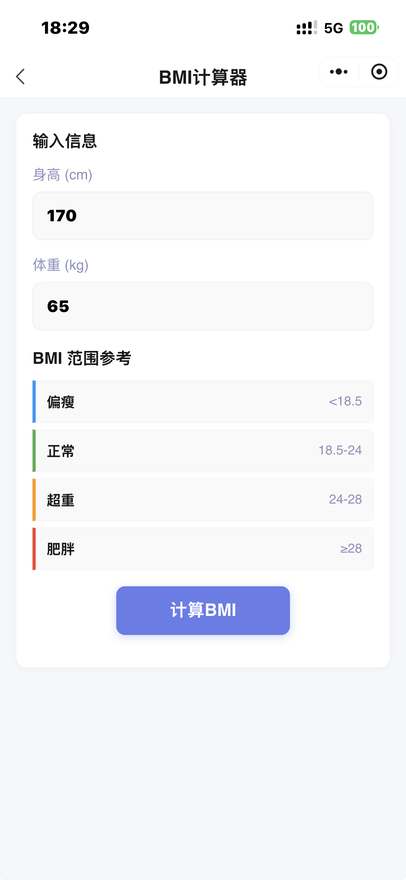 不用再死记 BMI 计算公式,只需输入身高、体重数值,就能一键算出精准 BMI 结果,同时配套标准体重参考范围,以及针对性的健康建议。不管是日常健身控重,还是常态化关注自身健康状况,随手就能测,随时掌握身体状态。