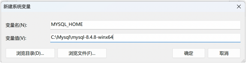 新建系统变量MYSQL_HOME,值为 mysql 路径,这里没有带 \bin
