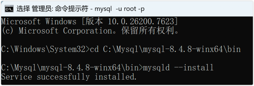 3. 重新打开一个 CMD 窗口(管理员身份),输入 mysql -u root,无需输入密码,直接按回车登录;