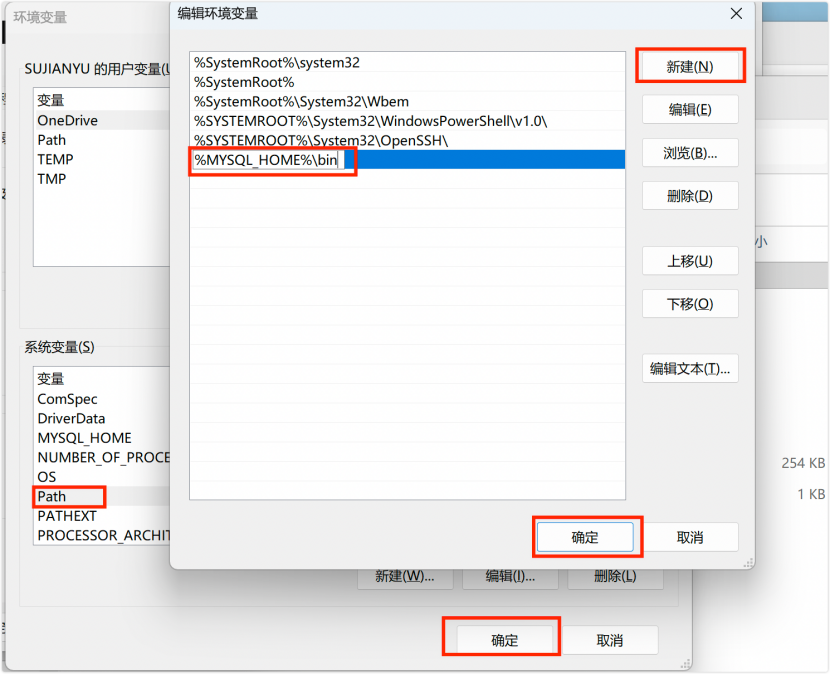 在 Path 路径值中加上 %MYSQL_HOME%\bin; 一步步点击确定就配置好了,注意:别不小心点成取消了,否则是不会生效的。