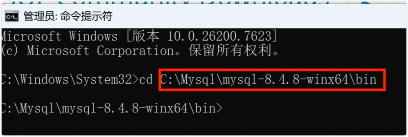 以管理员身份打开 cmd 进入 mysql 的 bin 目录(红框部分替换为自己的目录):