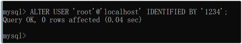 ALTER USER 'root'@'localhost' IDENTIFIED BY '1234';由于初始化产生的随机密码太复杂,不便于我们登录mysql,因此,我们可以修改一个自己能记住的密码